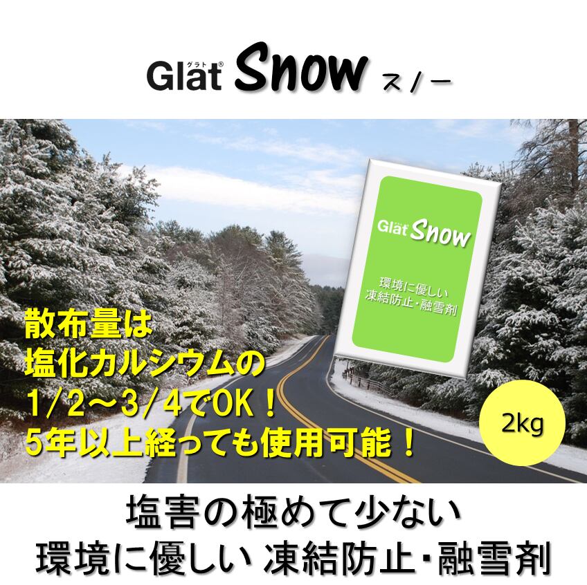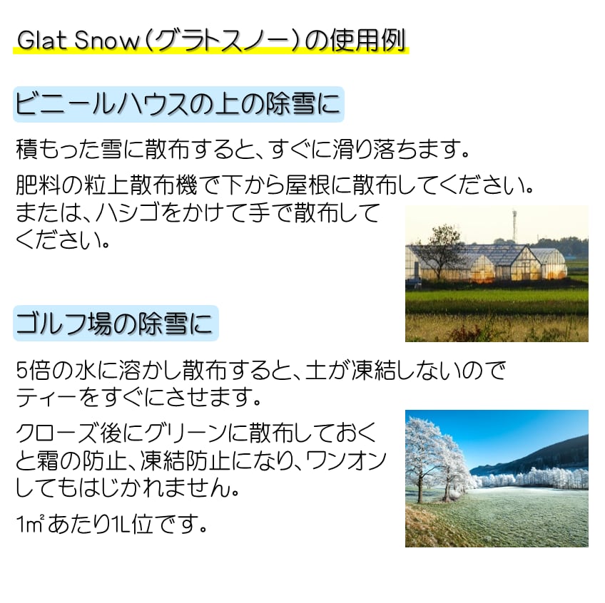Glat Snow(グラトスノー)は、塩害の極めて少ない環境に優しい、凍結防止・融雪剤です。