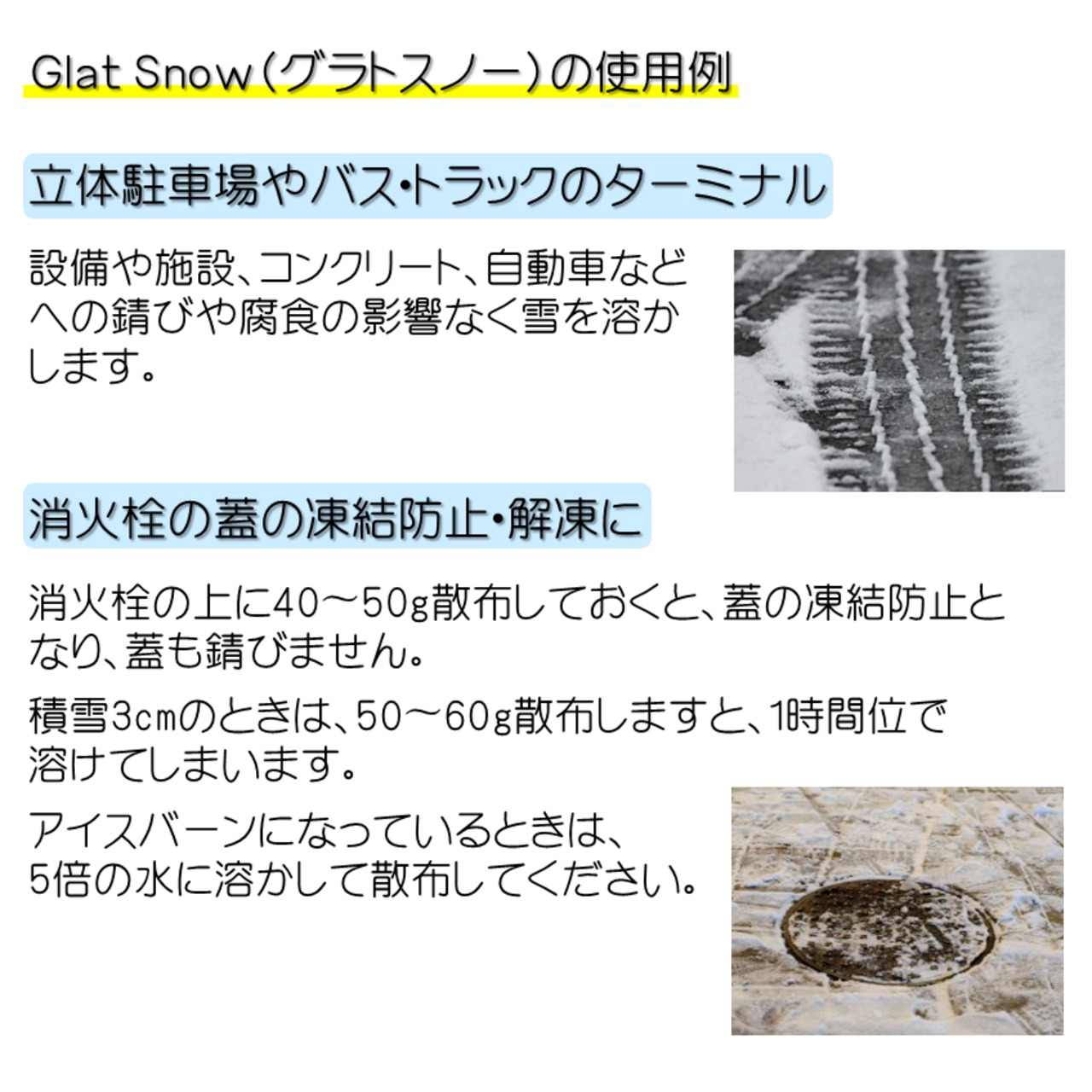 Glat Snow(グラトスノー)は、塩害の極めて少ない環境に優しい、凍結防止・融雪剤です。