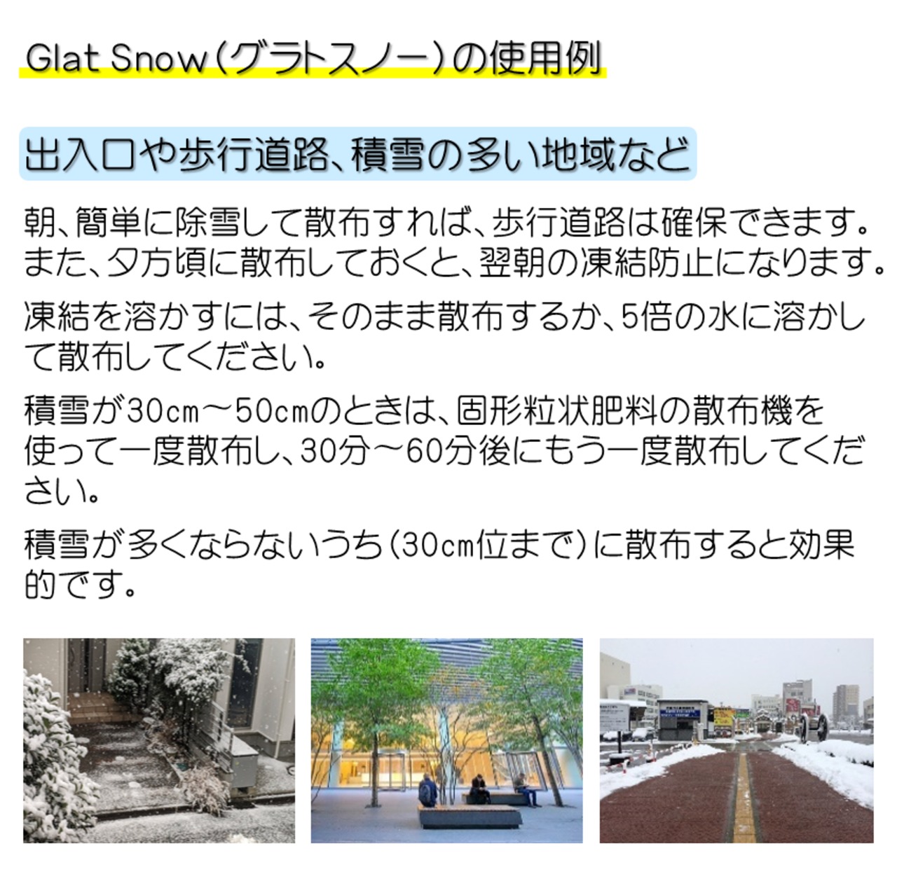 ・5cm以上の積雪、3cmの圧雪に散布する場合は、除雪した上で散布してください。